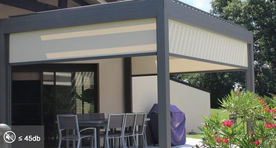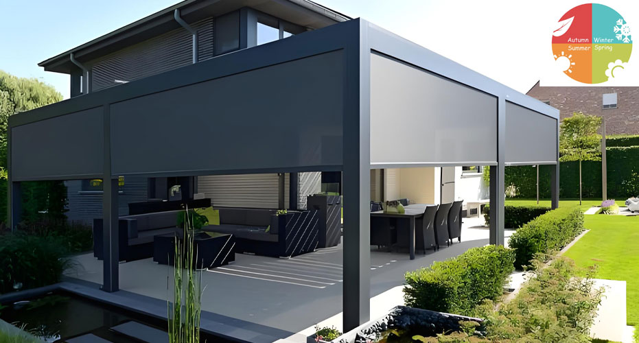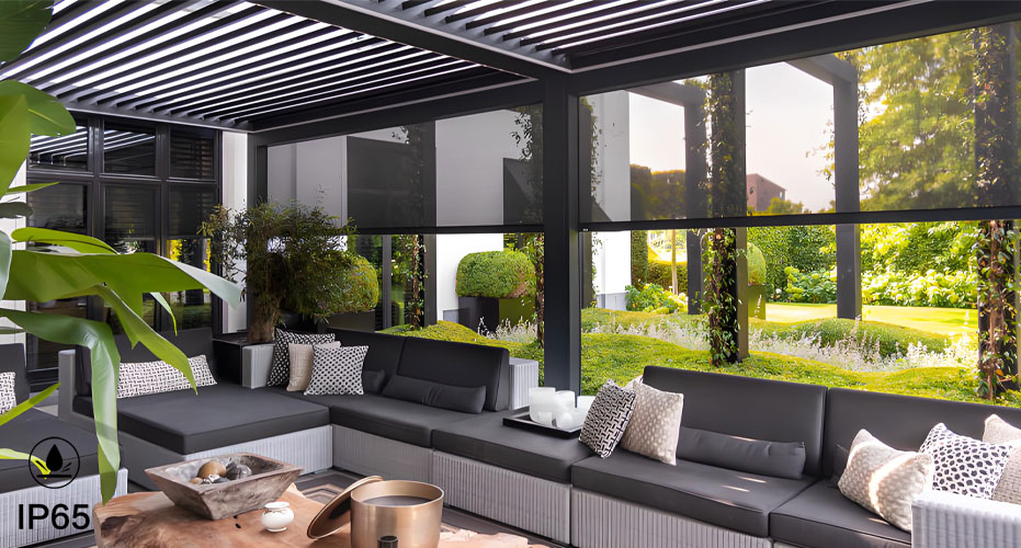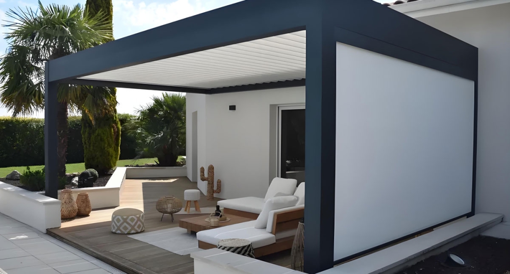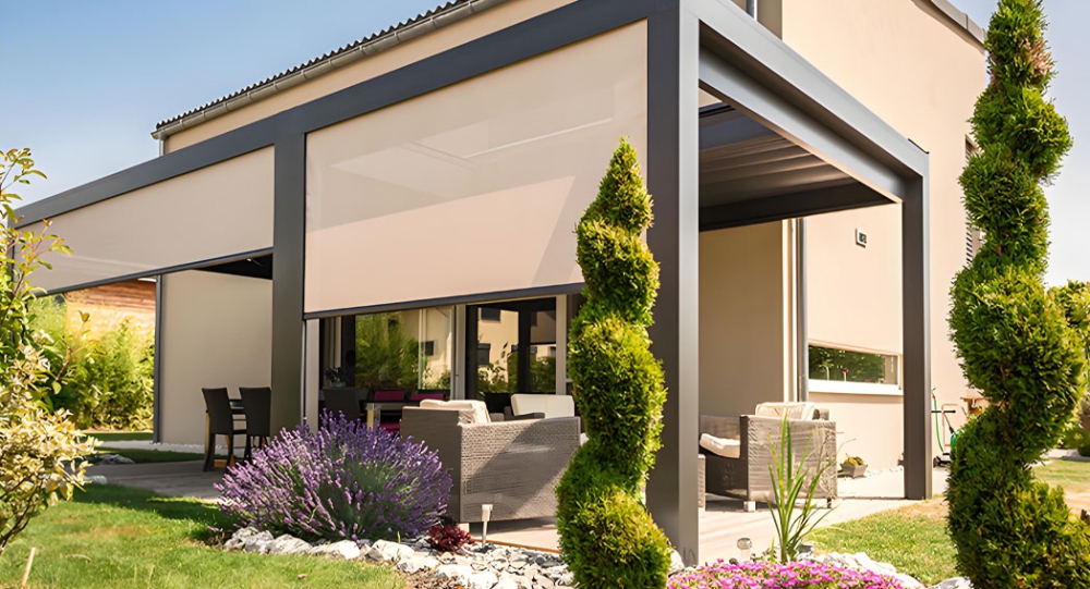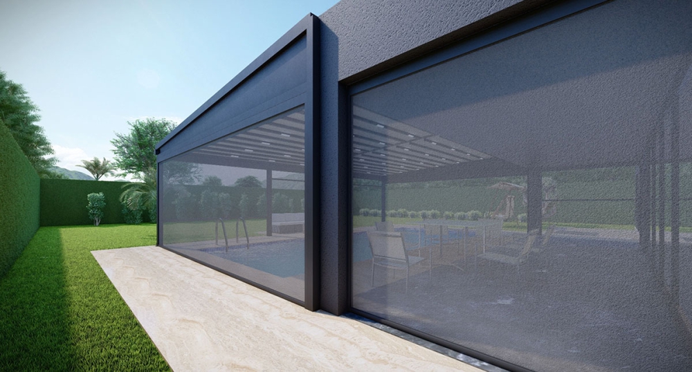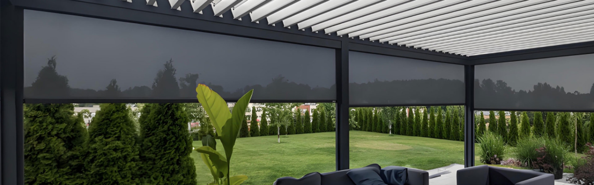 Pergolas with Side Screen: Motorized side screens for pergolas offer sun protection, wind resistance, and outdoor privacy, perfect for modern outdoor living.