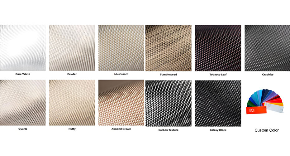 Available in multiple polyester fabric colors for our motorised screen shades, providing sun protection, insect resistance, and privacy to suit diverse outdoor design aesthetics.