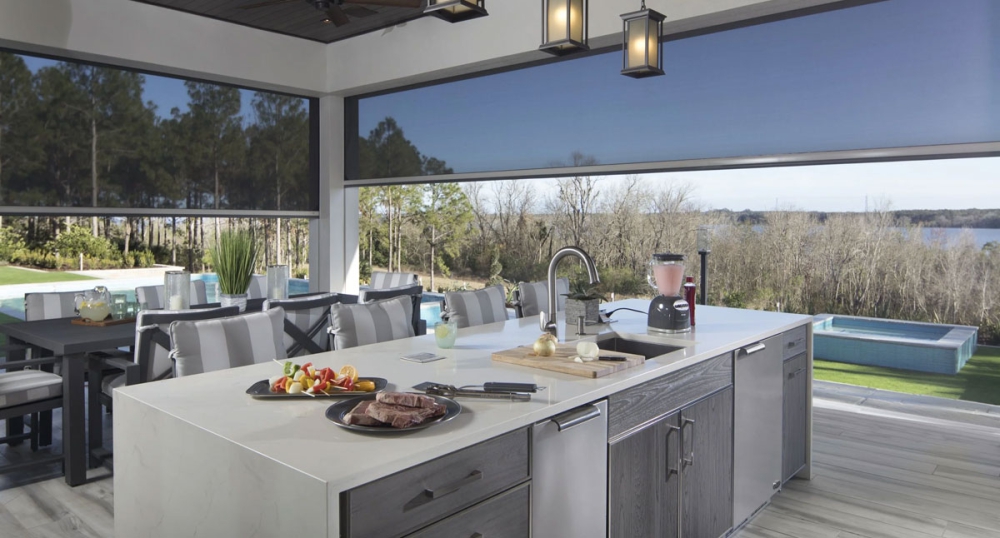 Outdoor Kitchens: Protect your outdoor kitchen on decks and balconies with motorized screen shades, enjoy cooking and dining without interruptions.