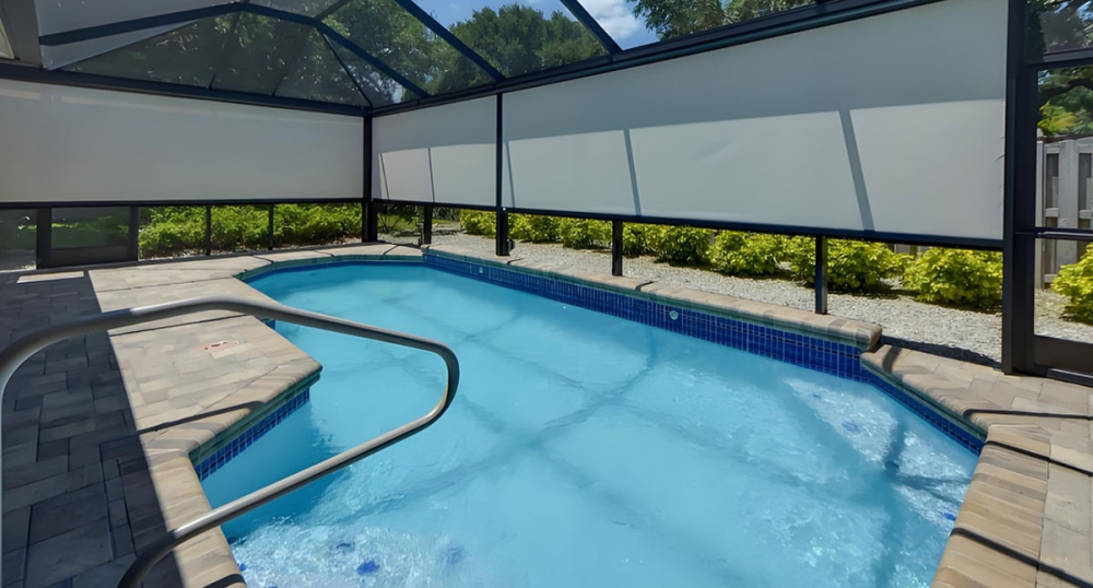 Pool Enclosures: Enhance your pool enclosure with BLD motorized screen shades for sun protection, privacy, and extended outdoor enjoyment.
