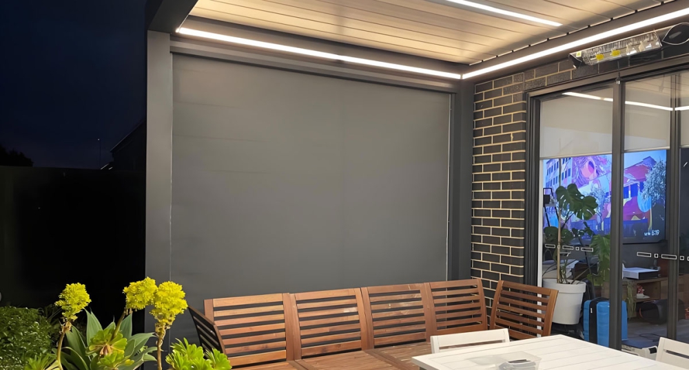 Backyard Pergolas in-Night: Motorized screens help create a cozy, private atmosphere for backyard pergolas at night—perfect for ambient lighting, evening gatherings, or quiet downtime.